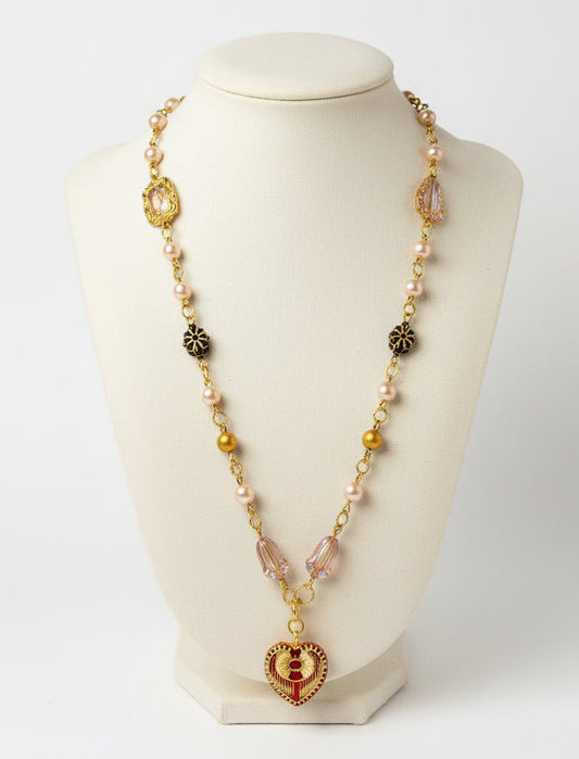 Pirate Queen of Hearts - Antique Style Charmed Golden Heart Handcrafted Necklace - Olive Made