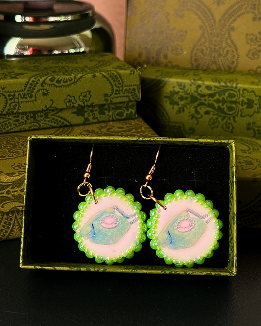 Neon Green Dial Up Phone Earrings | Polymer Clay Charm Earrings | Pearl Bedazzled Statement Earrings | 18k Gold Plated Hooks