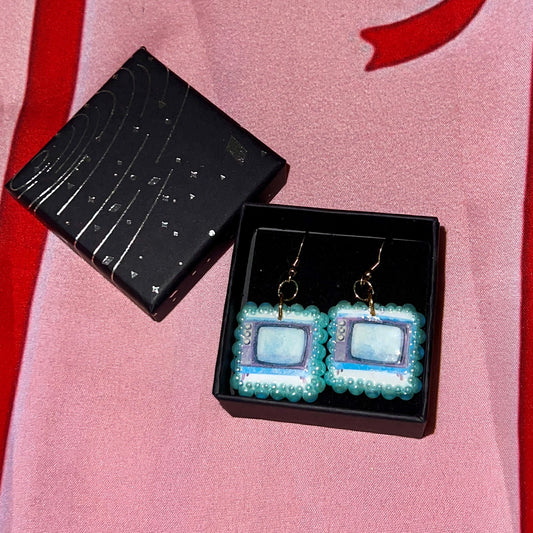 Vintage TV Set Clay Earrings | Teal Iridescent Pearl Frame
