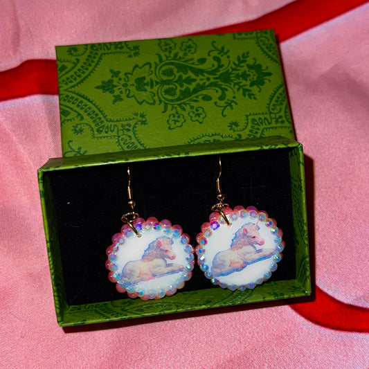 Unicorn Bedazzled Earrings | Handmade Polymer Clay Earrings | Iridescent Rhinestone Dangle Earrings | Y2K Fairycore Jewelry | Gift Ready