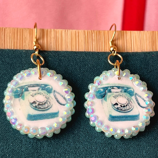 Iridescent Teal Dial Up Phone Earrings | Polymer Clay Charm Earrings | Pearl Bedazzled Statement Earrings | 18k Gold Plated Hooks