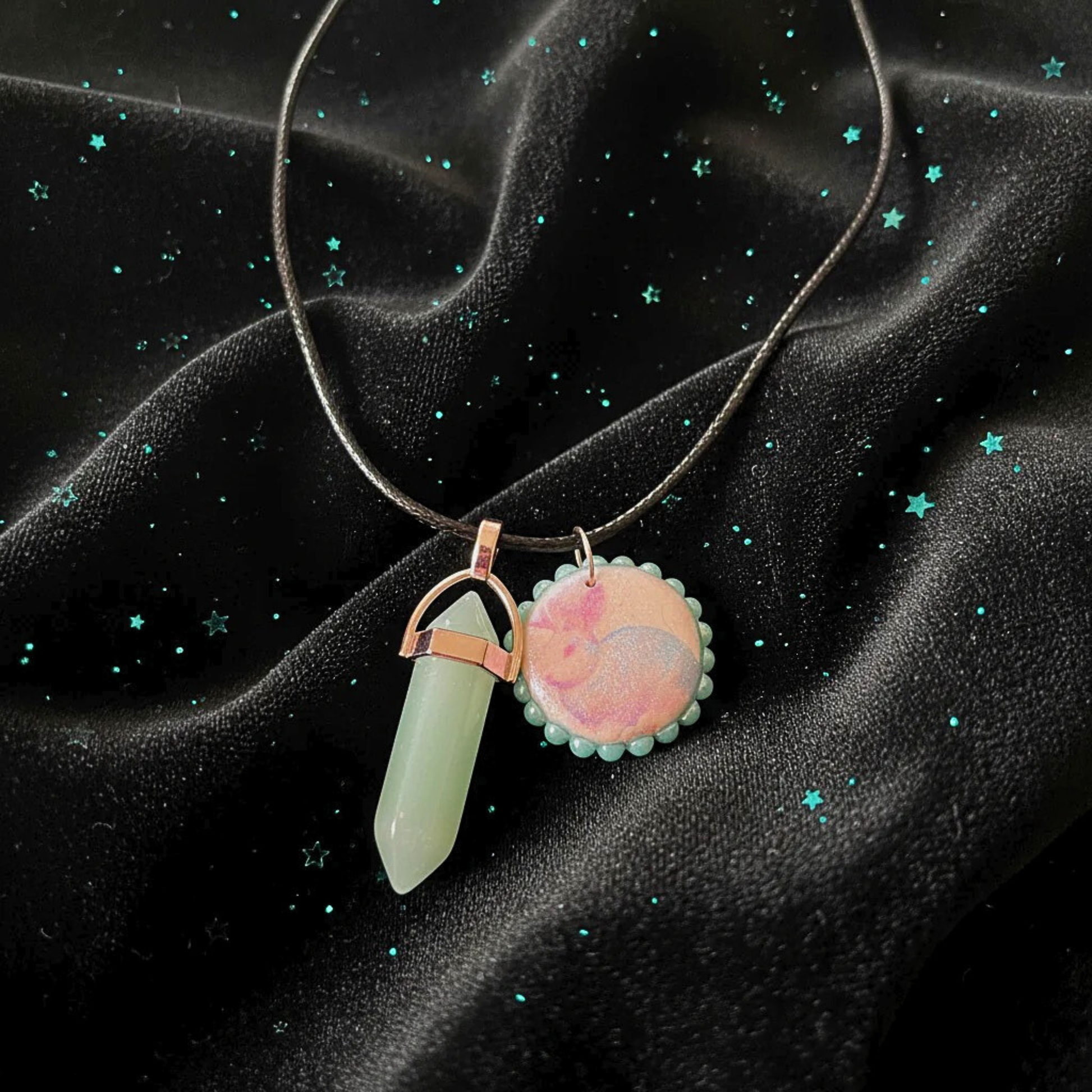 - Milky blue gem + mini circle jackalope with iridescent topcoat (illusion into a magical world)