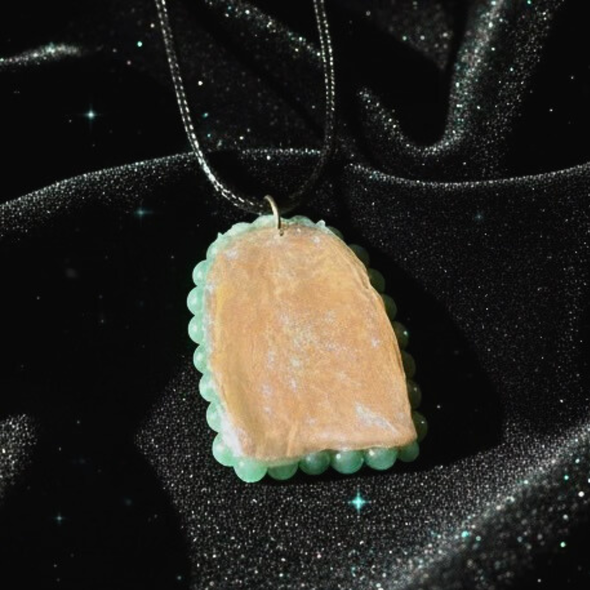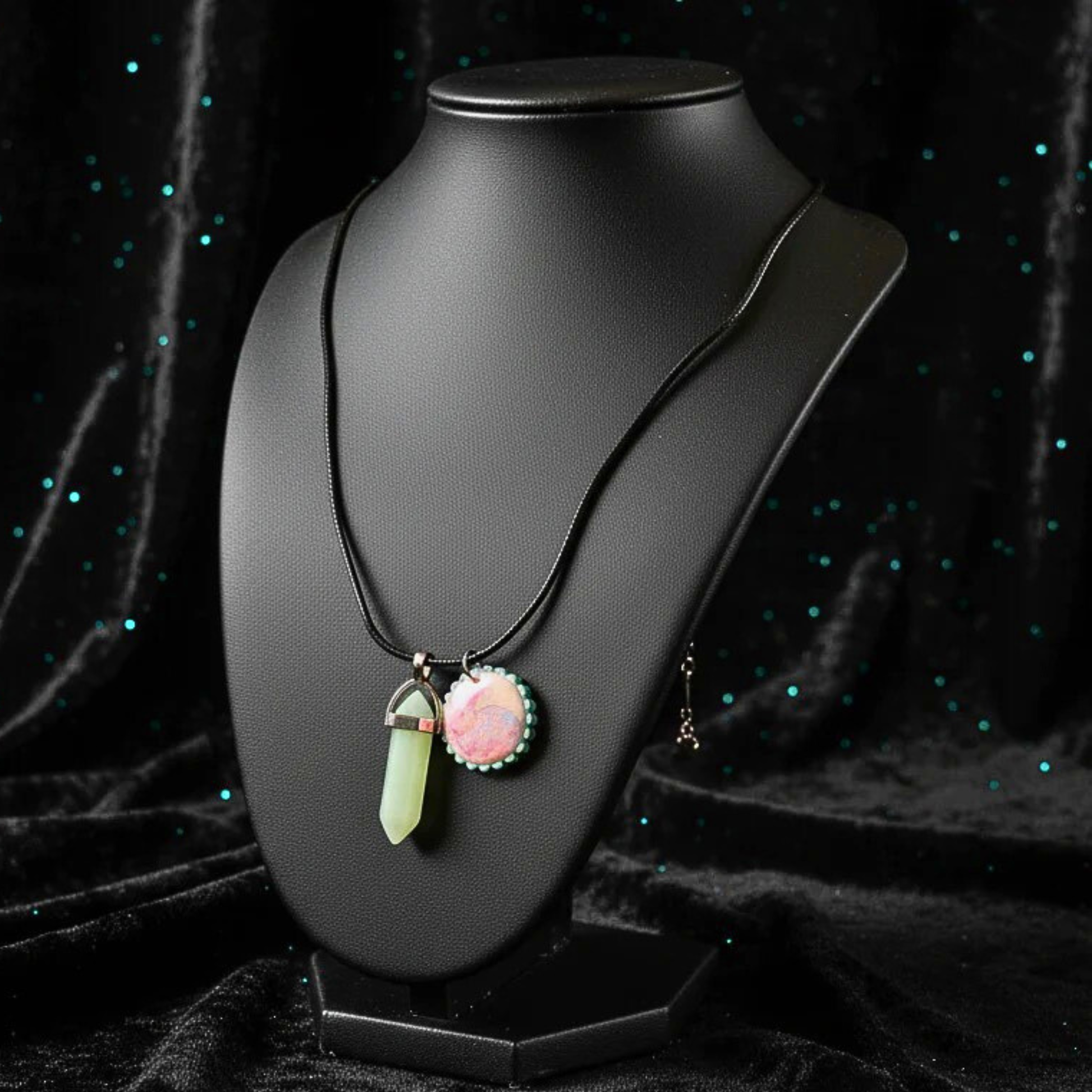 22” adjustable faux leather chain with handcrafted, bedazzled clay charms + gem pendants.