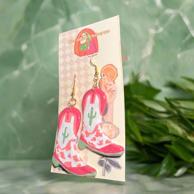 Cactus Cowprint Boots - Handmade & Hand Painted Charm Earrings - Olive Made