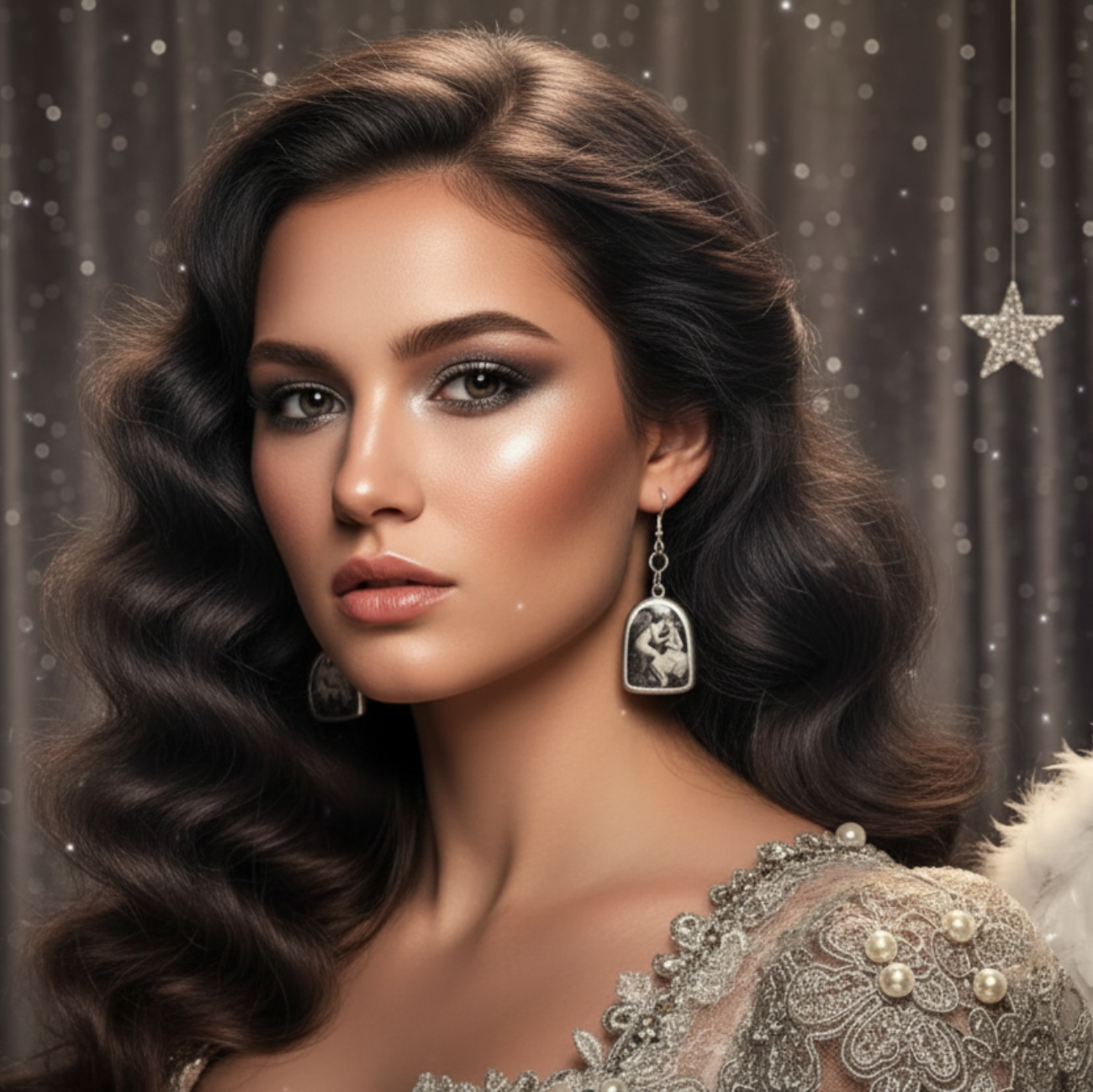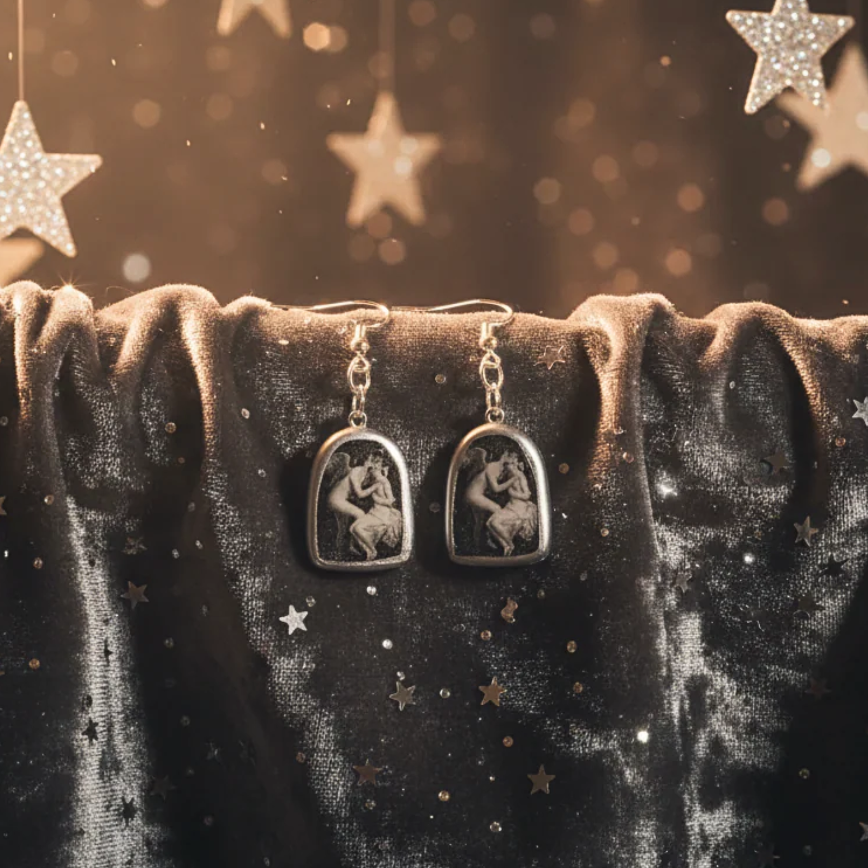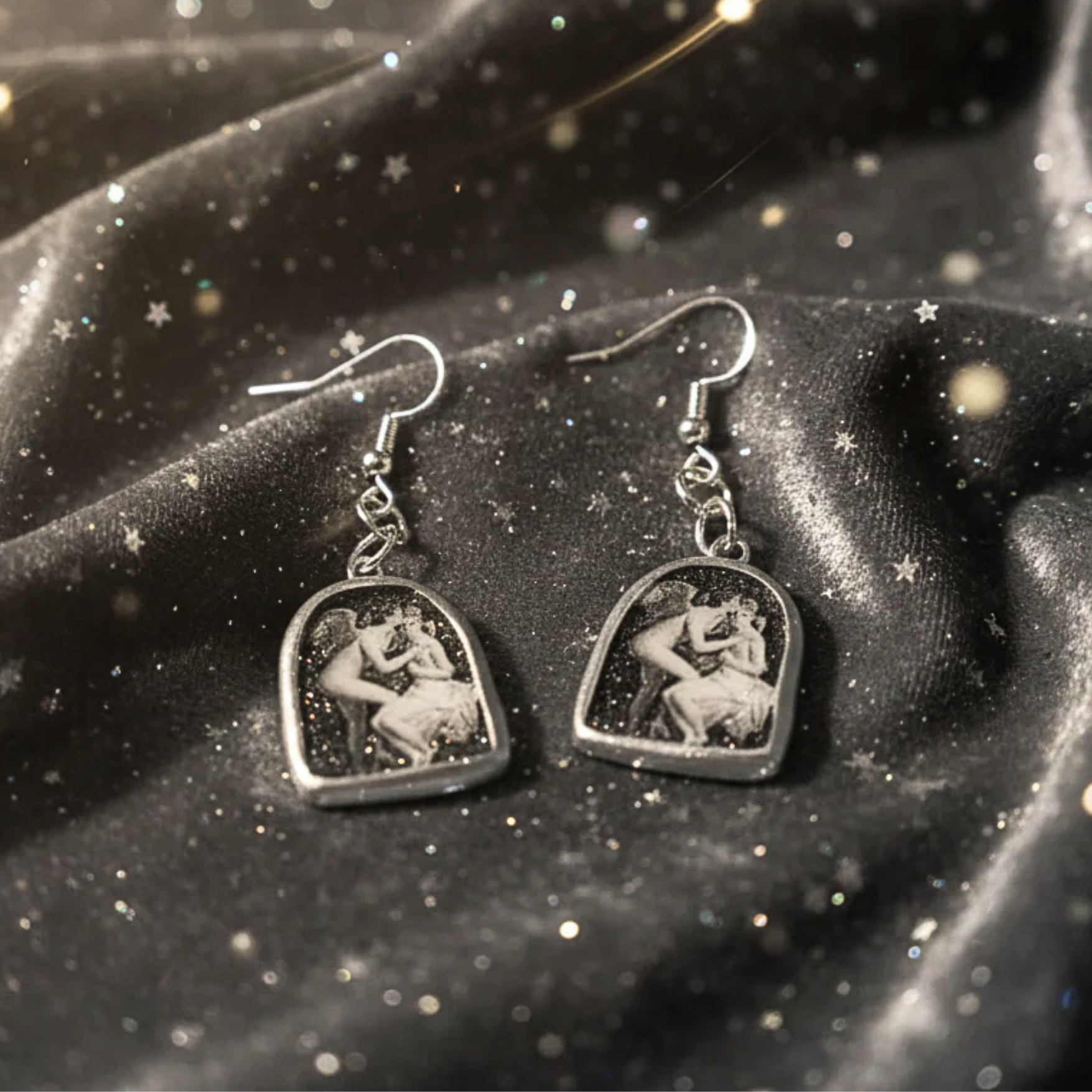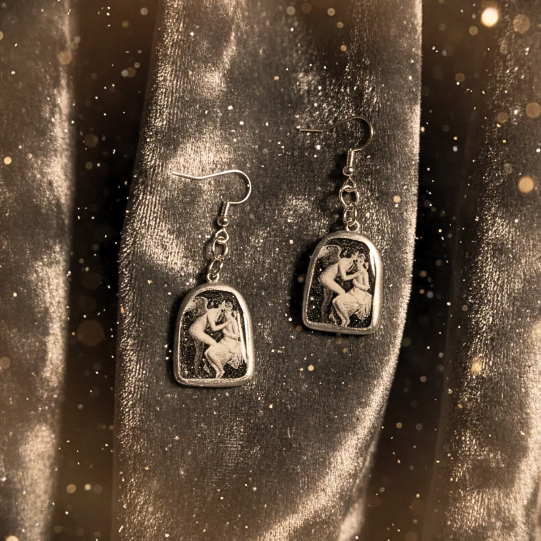 A small archway opens onto Cupid and Psyche—captured at the edge of devotion, desire, and consequence. Inspired by François Gérard’s Allegory of Eros and Psyche (1798), this pair turns a timeless myth into wearable art: romantic, refined, and quietly otherworldly in black, white, and silver.