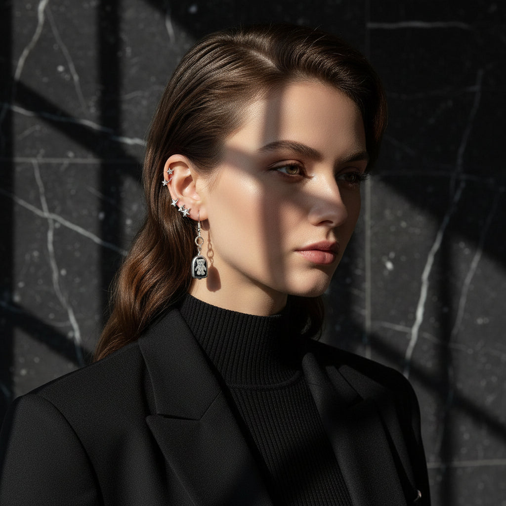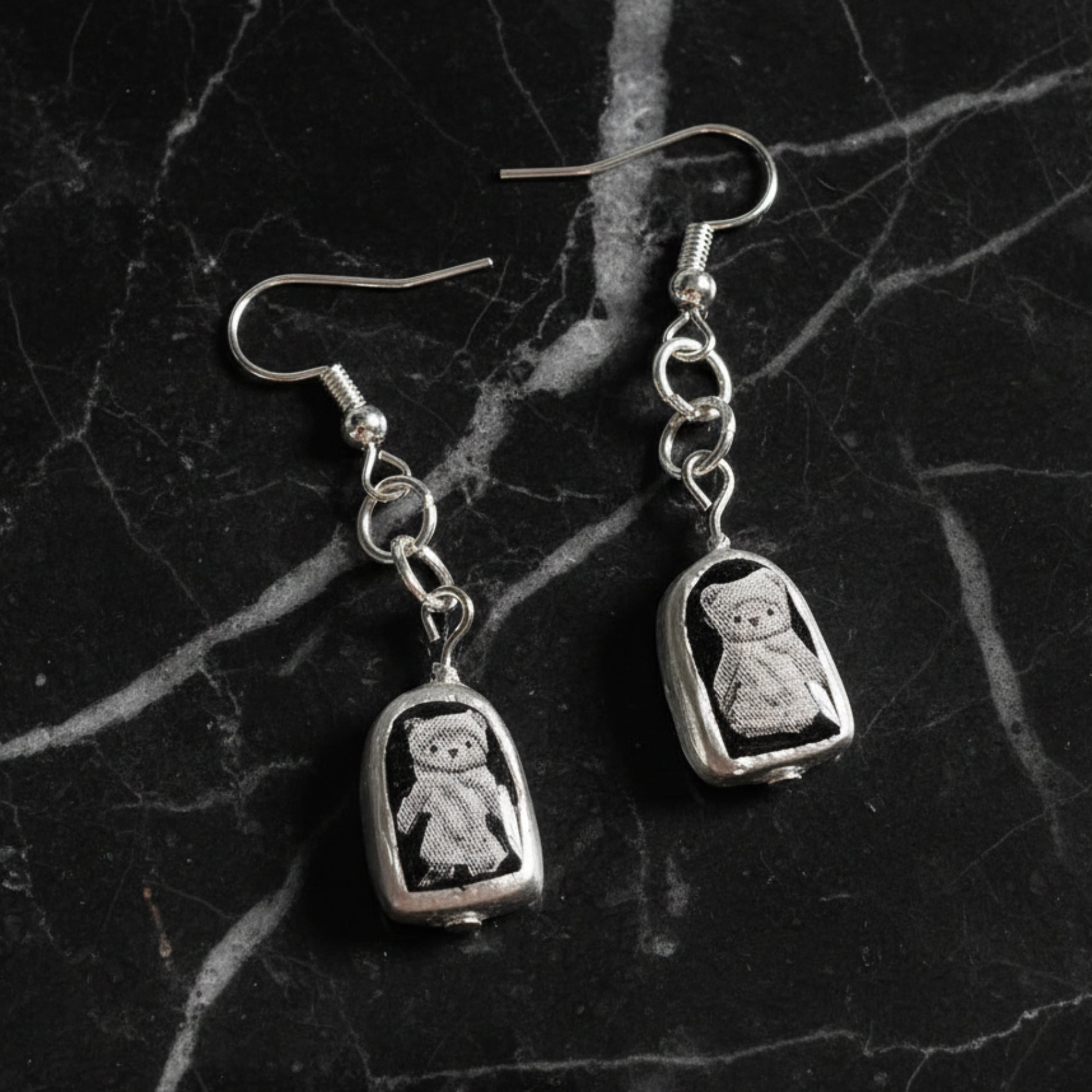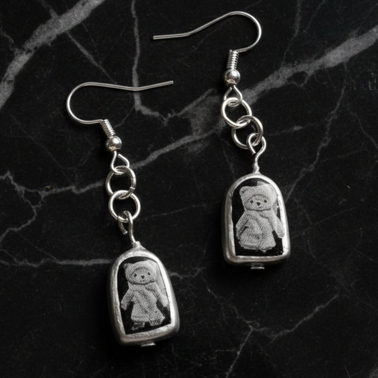 Each hand-painted polymer clay charm features a halftone teddy bear wrapped in a cozy scarf-hood, captured in a Y2K-inspired aesthetic that feels both vintage and timeless. The bear rests against a rich black background, framed by miniature silver arches that add architectural movement to these wearable keepsakes.