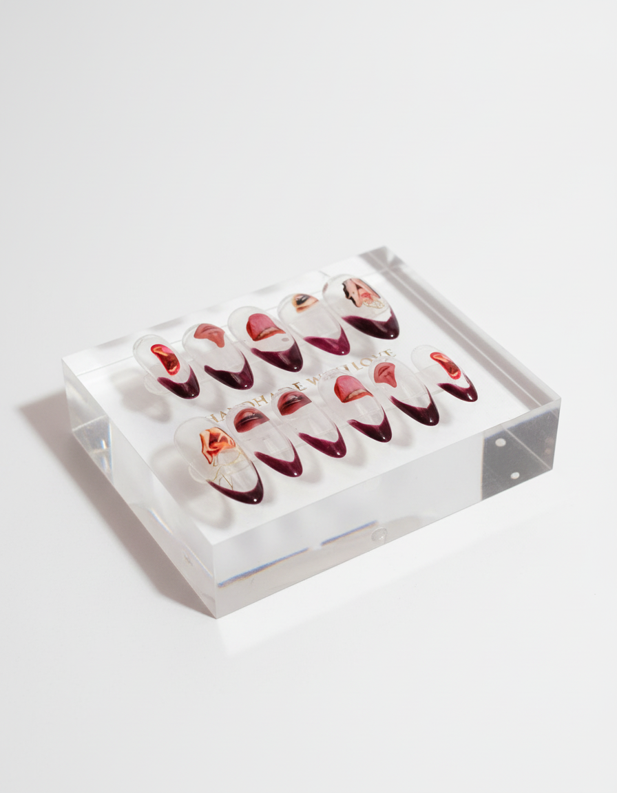 Do you ever feel the universe staring back at you? These nails channel the surrealism of October shadows, where dadaist absurdity meets witchy glamour. A transparent base allows the haunting retrowave art to float like apparitions across your fingertips, while deep maroons and distorted faces summon a gothic, otherworldly aesthetic.