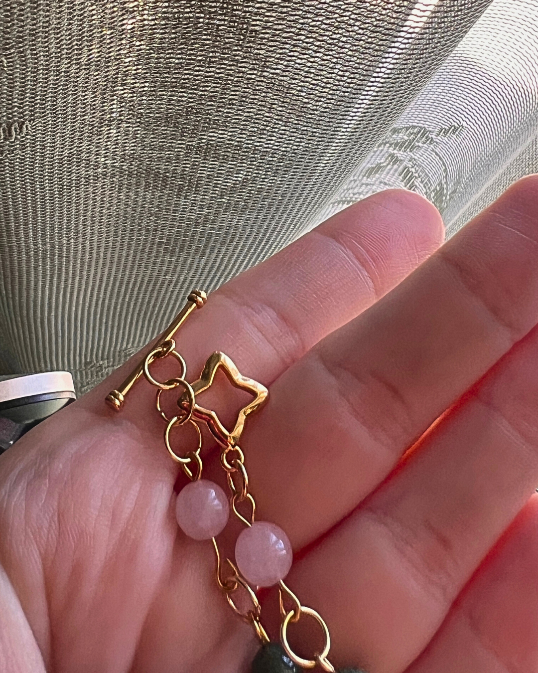 - Stones: rose quartz, Indian agate, upcycled rutilated quartz