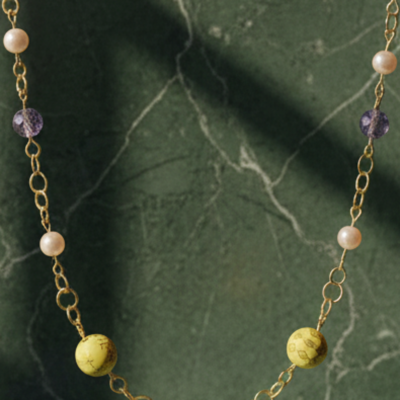• Statement beads: teal, lime w/ gold detailing, purple & blue translucent