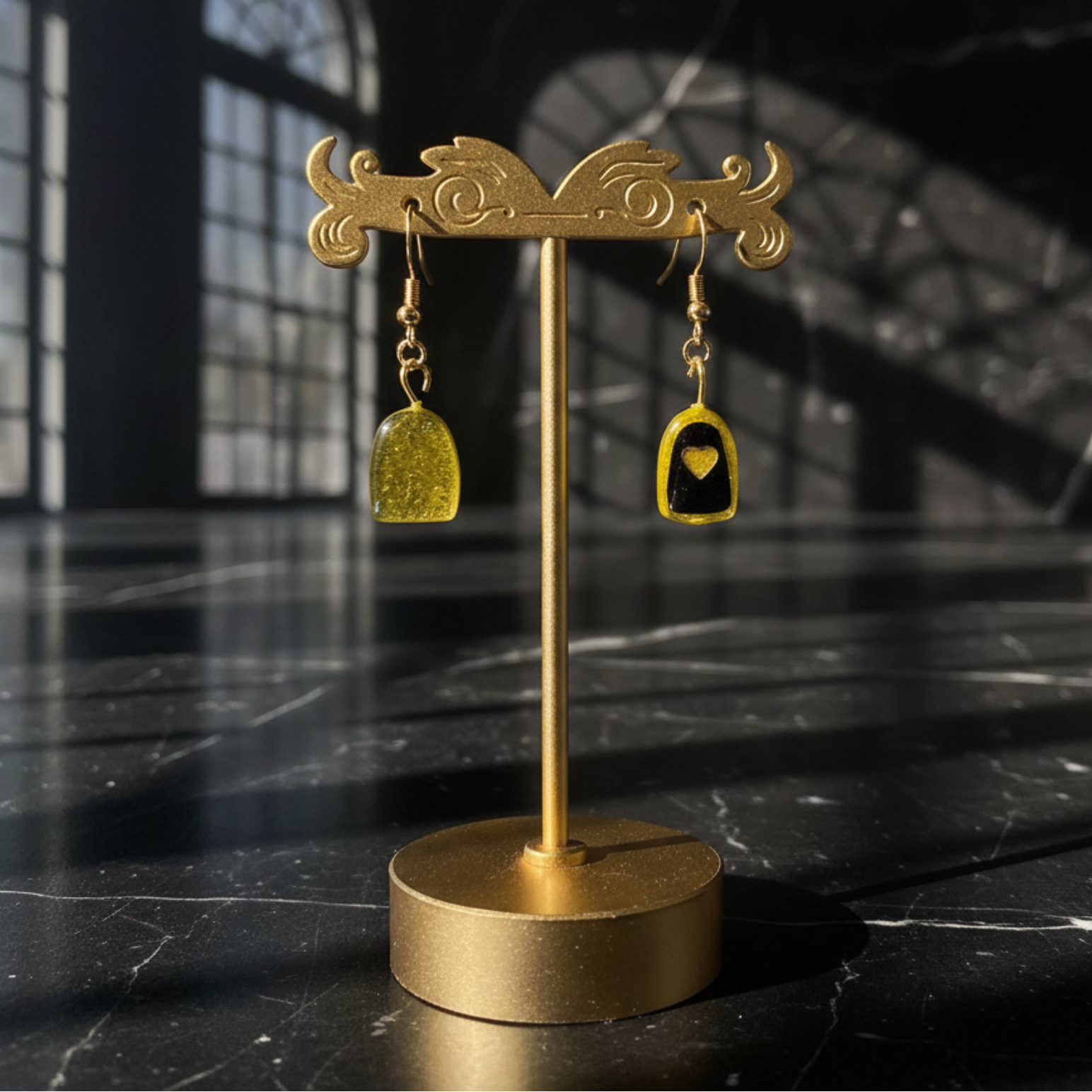 Wearable architecture for the elegantly unconventional. These Mini Heart Arches marry the darkness of hand-sculpted black hearts with the luminosity of 18k gold-plated arch findings—a study in contrasts that embodies business goth chic.