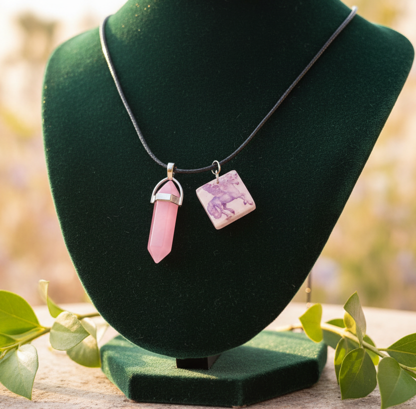 Before screens, before endless scrolling—when a single charm could feel like a portal. This handmade necklace is a small, luxurious talisman: an adjustable black leather chain finished with hand-sculpted polymer clay charms and luminous gemstone accents.