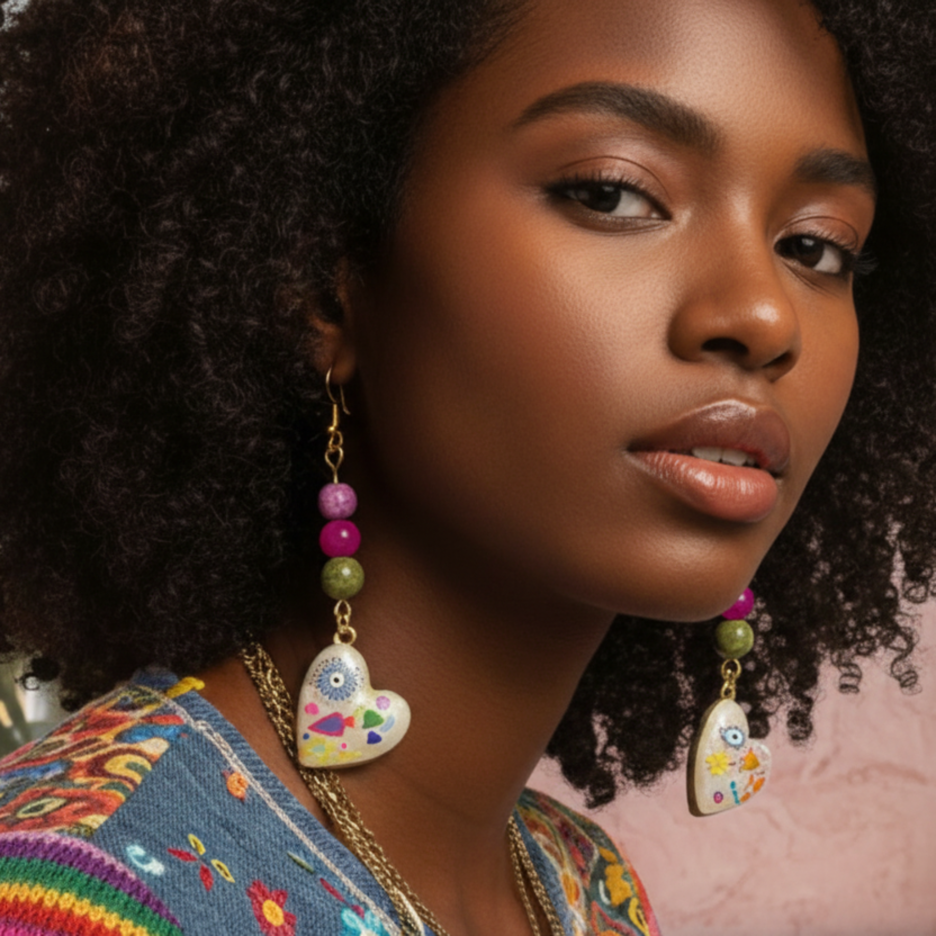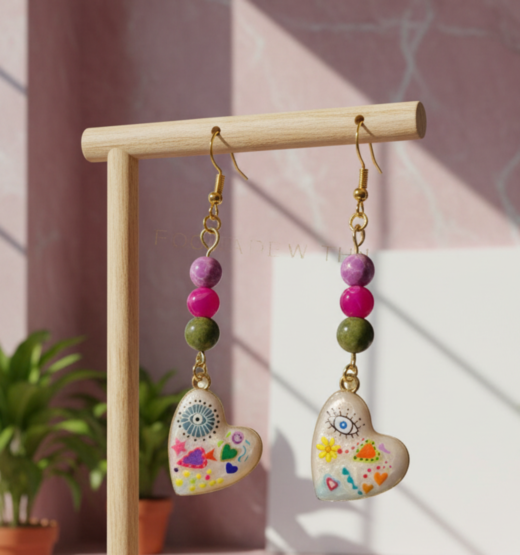 Imagine a surrealistās palette come to lifeāstars, flowers, protective eyes, and golden-lined pearlescent hearts dancing together in perfect abstraction. Each earring is a handcrafted statement, blending authentic Purple Jasper, Pink Agate, and Unakite stones with shimmering golden details. The result? Earrings as conceptual and vibrant as you are.