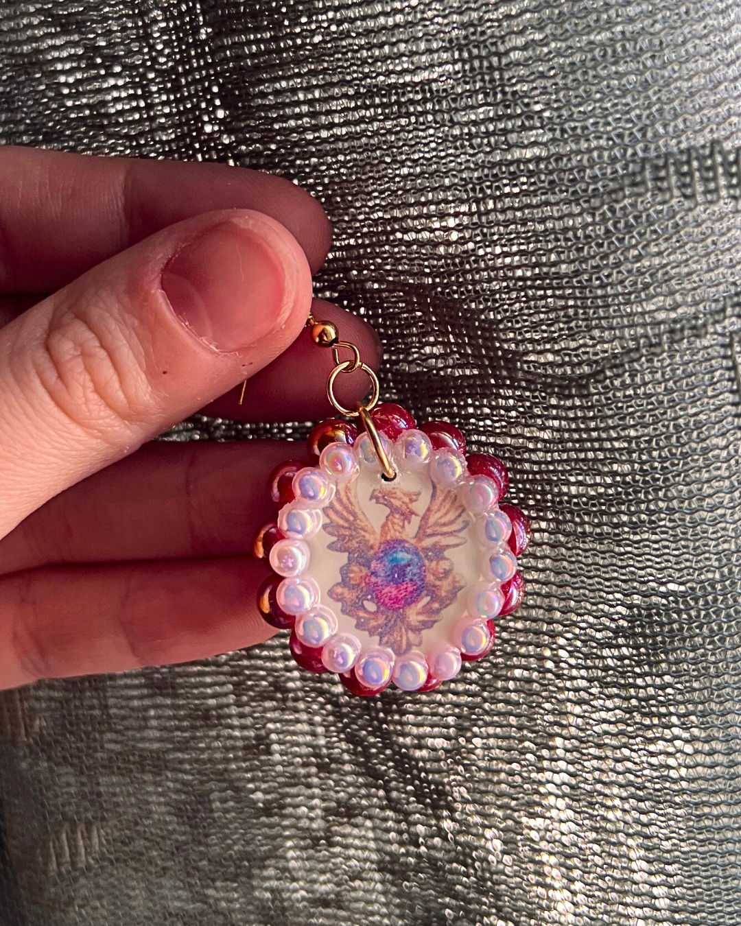These regal, medieval-inspired earrings feature circular polymer charms with a gilded phoenix sigil holding a crimson gem, framed in bedazzled red and iridescent pearl-like beads for a jeweled, courtly finish.