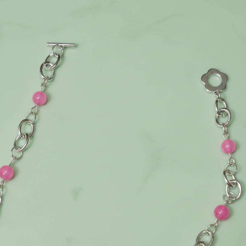 Handmade & painted clowncore angel pendant. crafted from polymer clay, this clown angel features and pink & green jester inspired outfit and clown makeup. placed on a silver chain, this clown pendant is complimented by pink agate & authentic grey marble beads. finish with a whimsical flower shaped toggle clasp, this necklace is a 24 inch necklace