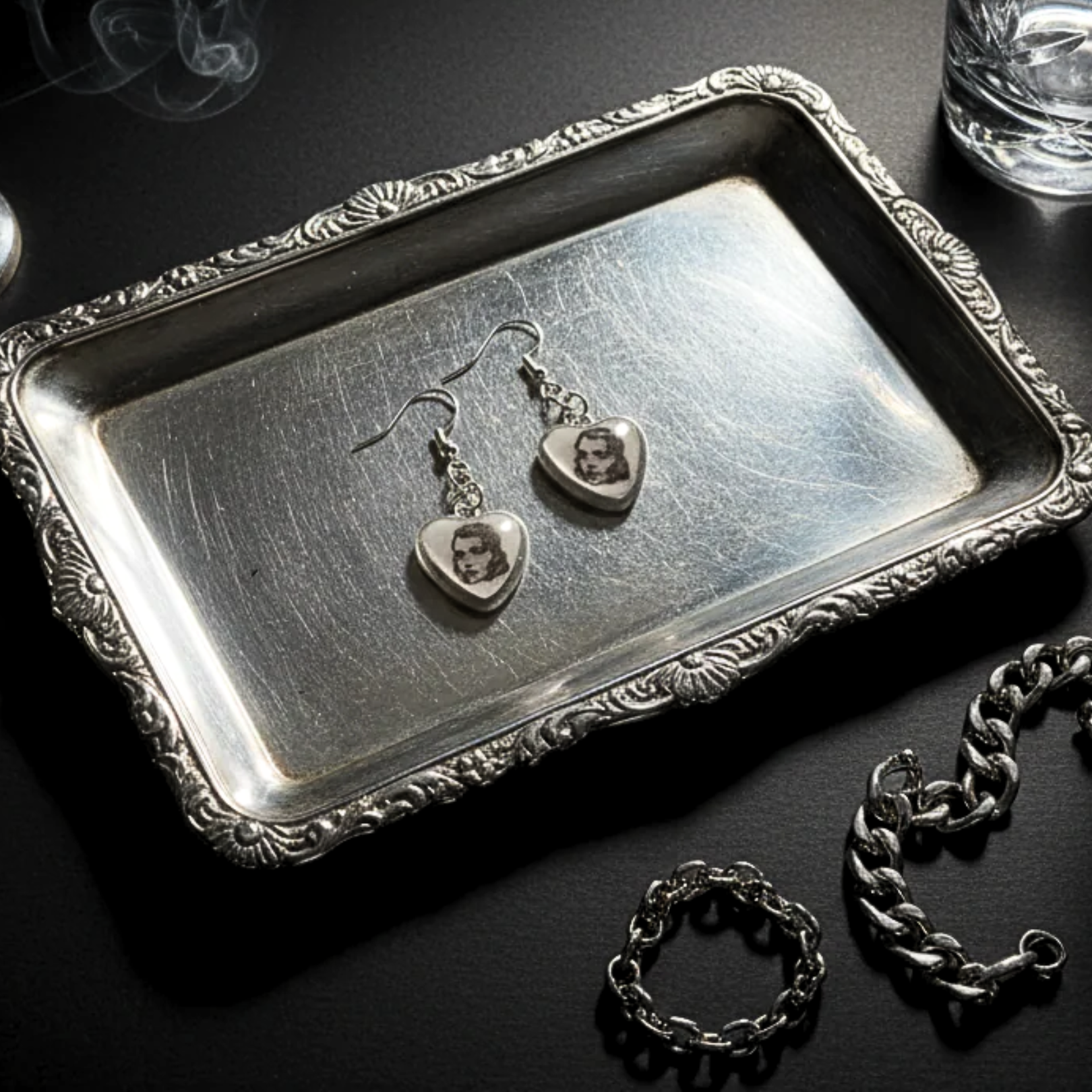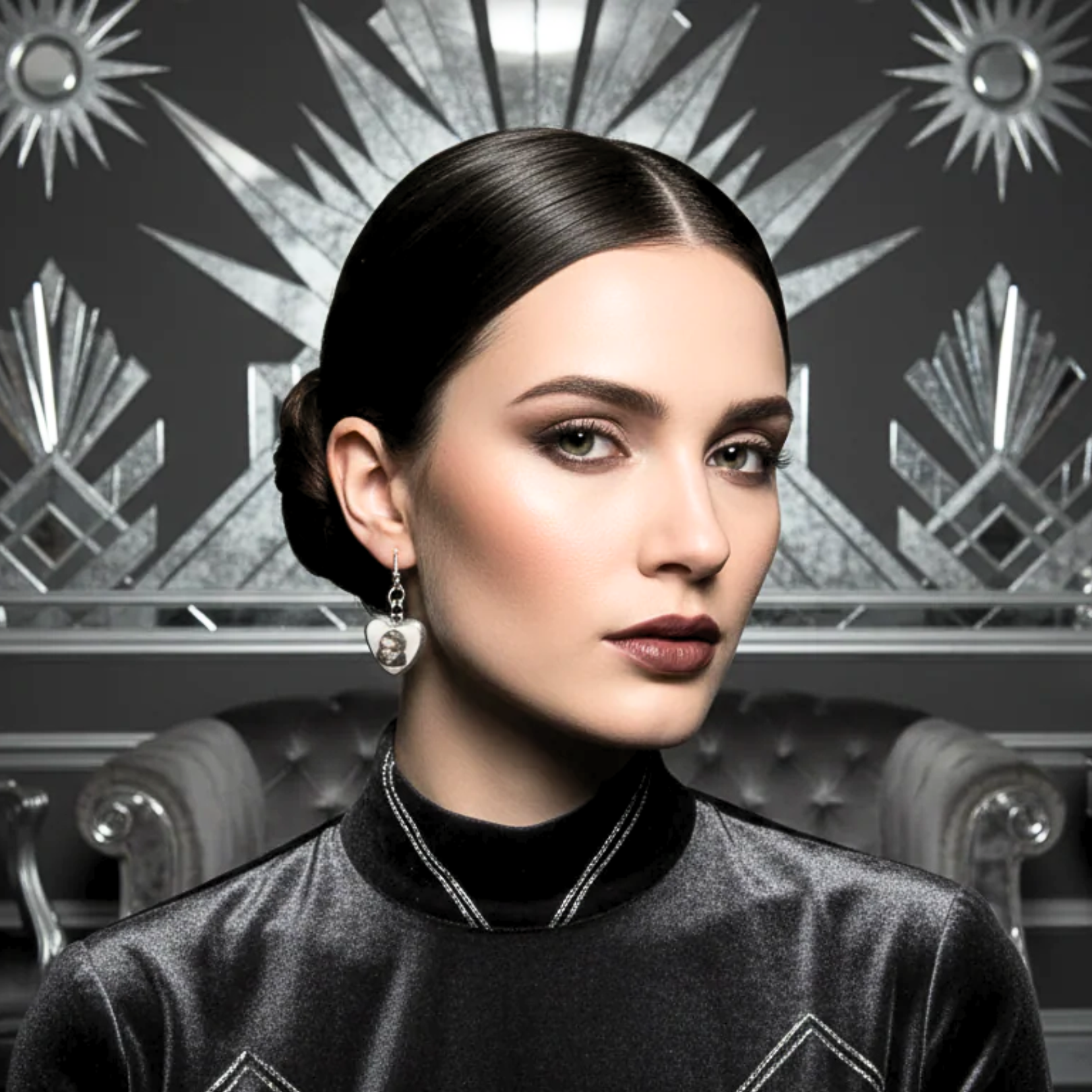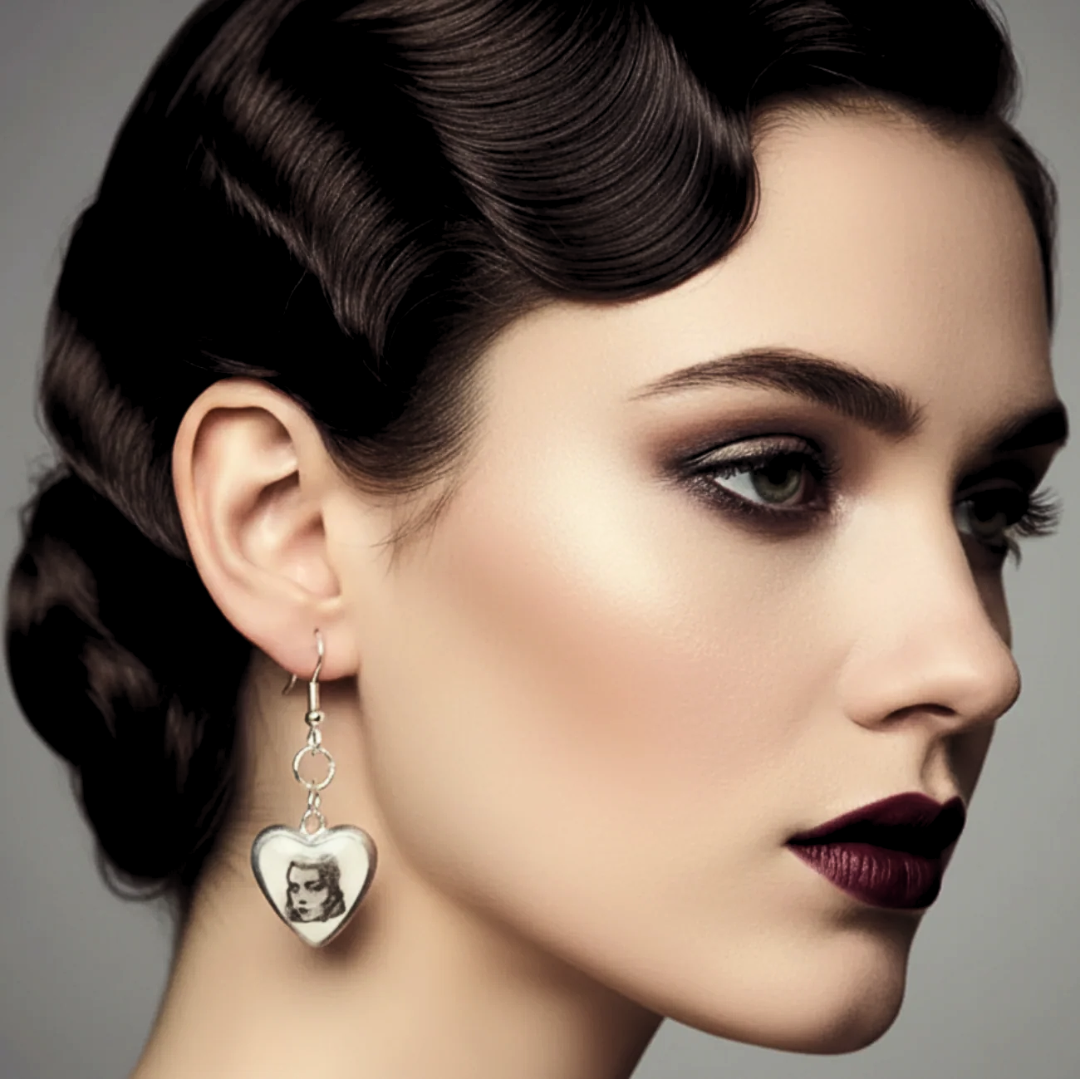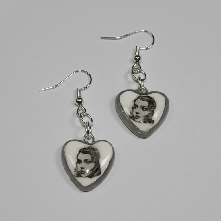 Handmade from polymer clay and finished with metallic detailing, each charm is sealed in a thick, glass-like gloss that feels luxurious and pleasantly weighted. The surface features halftone-inspired imagery (portraits, cute creatures, and retro tech motifs), so every pair reads like a miniature collectible.